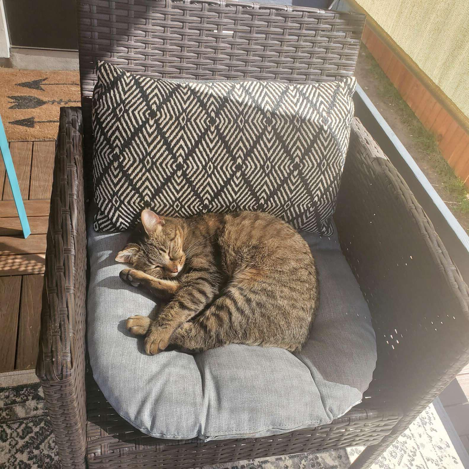 ▼有一天Liz看到Cheeky在門廊前曬太陽,Sushi則放鬆地躺在牠的懷裡,跟牠依偎在一起,那畫面非常有愛。