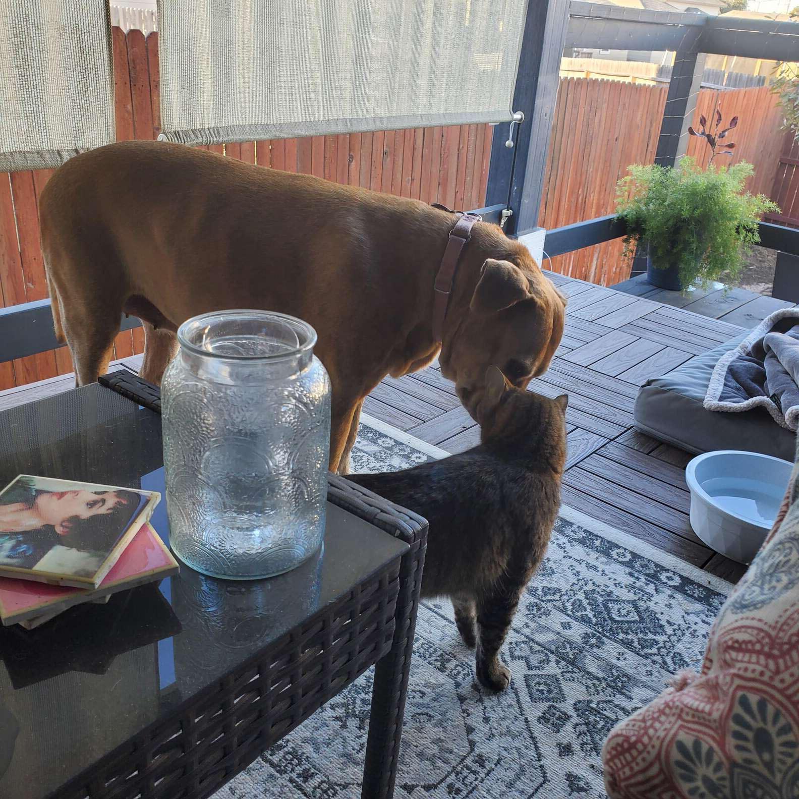 2022年02月23日美國德州聖安東尼奧(San Antonio)女子Liz Heck養了一隻14歲的狗狗Cheeky。Liz平時會幫忙中途小貓,家裡經常會有浪貓來討食,所以Cheeky很擅長跟貓咪打交道。最近一隻怕生的浪貓Sushi跑來蹭飯,友善的Cheeky融化了牠的心,讓牠願意卸下心防,留在這裡生活~