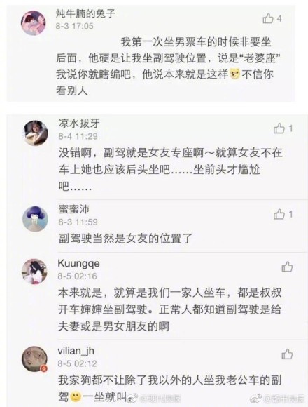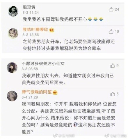 ▼這位男友十分不解女友的行為,底下網友則解釋說:「沒錯啊,副駕就是女友專座」、「有眼色點的女生都知道不坐有女朋友的人的副駕」、「我跟男生朋友出去,知道他女友要來,就會自動坐到後面去」、「我坐我爸車副駕駛,我媽都不開心。」但也有人困惑:「就坐了個位置而已,現在的女孩都這麽矯情?」
