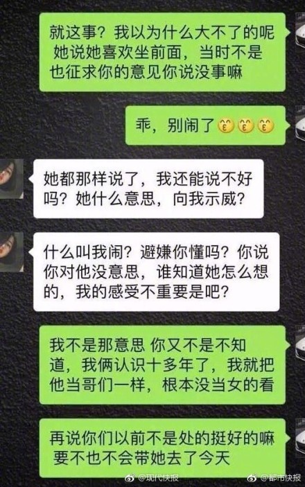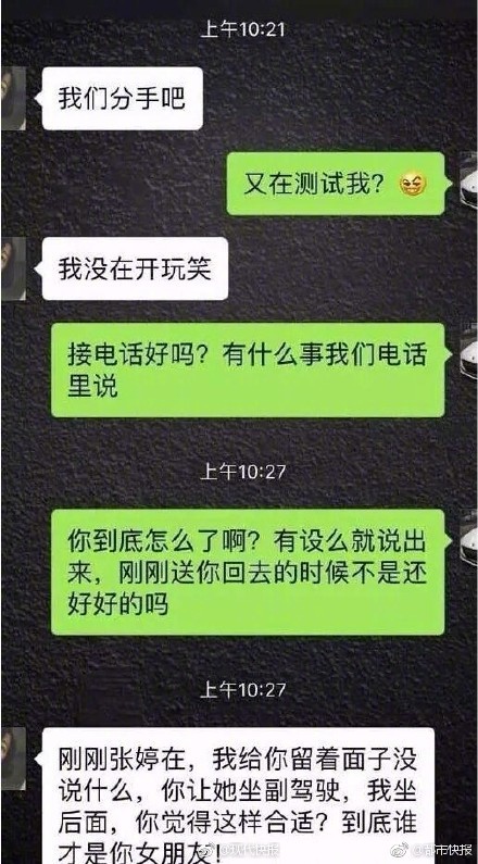 ▼這位男友在微博上貼出對話截圖,指出不明白女友為何要跟他分手。一開始,他以為女友在開玩笑,後來女友才認真說:「剛剛張婷在,我給你留著面子沒說什麼,你讓她坐副駕駛,我坐後面,你覺得這樣合適?到底誰才是你女朋友!」