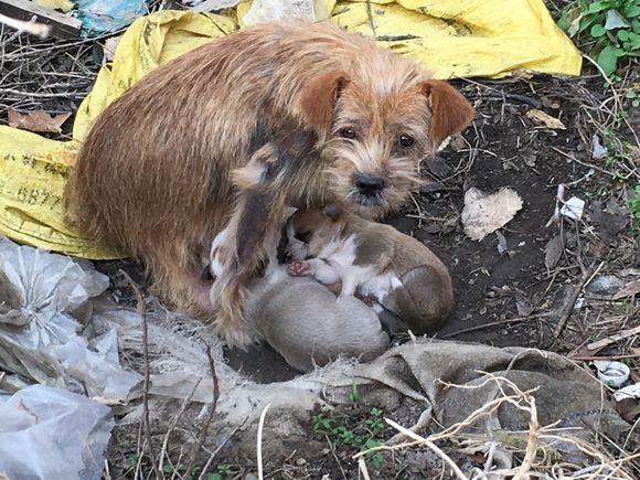 ▼最後來到一個垃圾桶旁邊的草叢,浪浪對著草叢叫了兩聲,不一會衝出兩隻可愛的小毛孩。兩個小傢伙撲倒媽媽懷裡,開心的吃喝奶,好心人徹底被這一幕感動了。