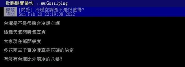 2022年02月22日這兩天受大陸冷氣團影響,各地天氣較冷。有網友在PTT的Gossiping板上發文說,他認為台灣的天氣很適合購入冷暖空調,這溫度開暖氣真的很舒服。貼文曝光後很快引發網友討論,不少網友表示冷暖空調非常好用,很後悔之前沒有買~