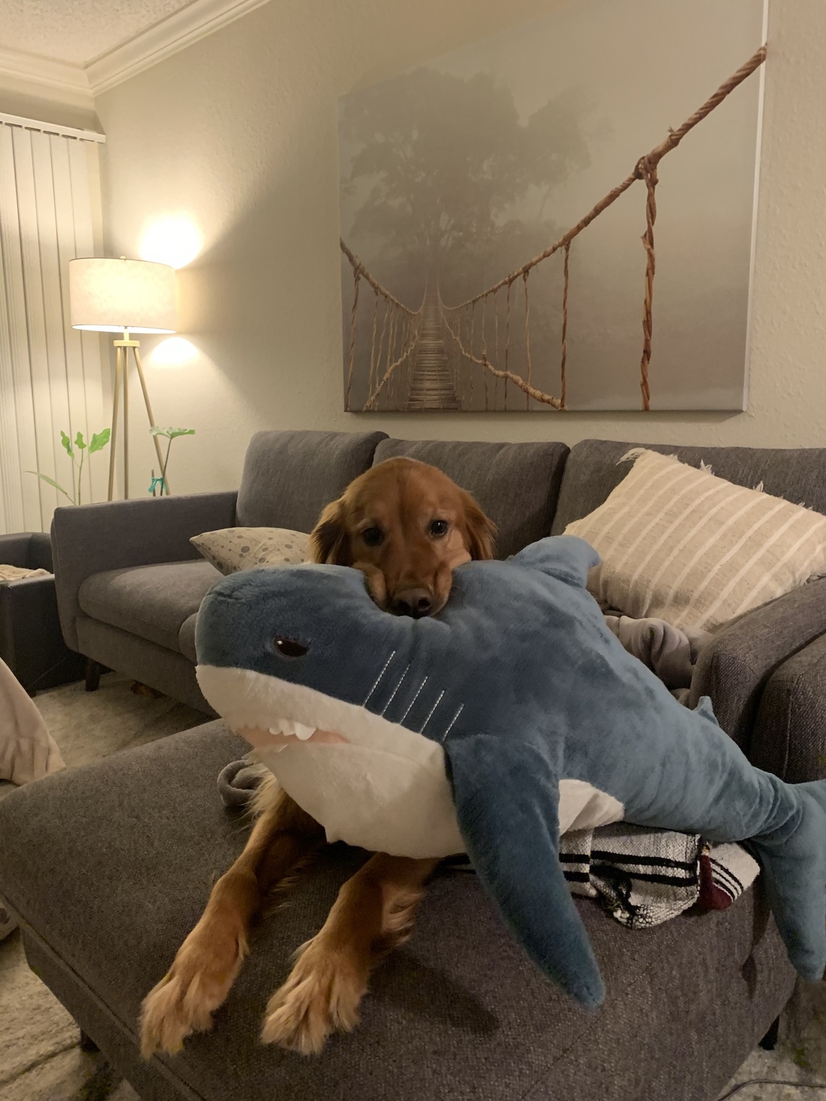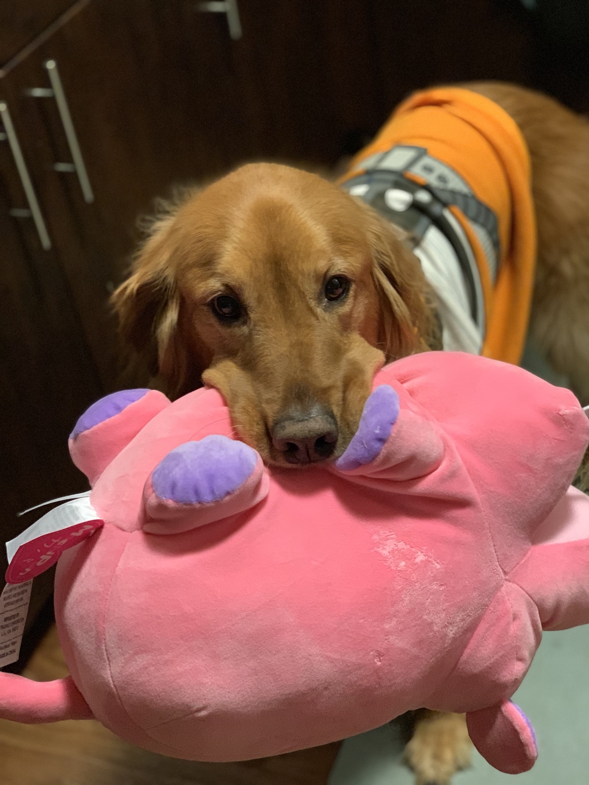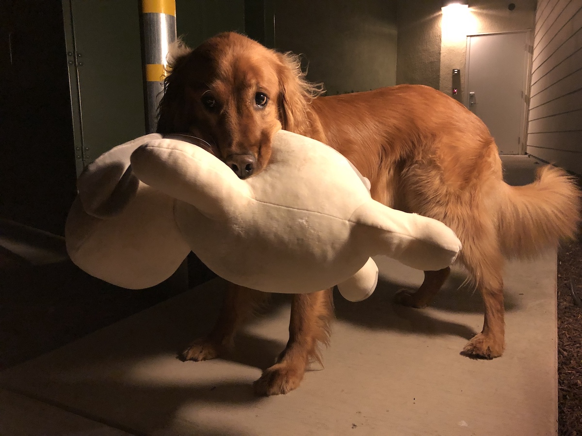 2022年02月22日這隻黃金獵犬波賽頓、或稱小波(Poseidon,簡稱Poi)去哪總是會叼著一隻絨布娃娃,像是人類小時候喜歡抱著一條小毯毯一樣,小波和主人一起出門散步逛街的時候,嘴裡也總是要咬著一個娃娃,牠才會覺得安心。