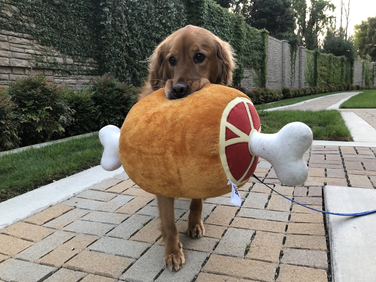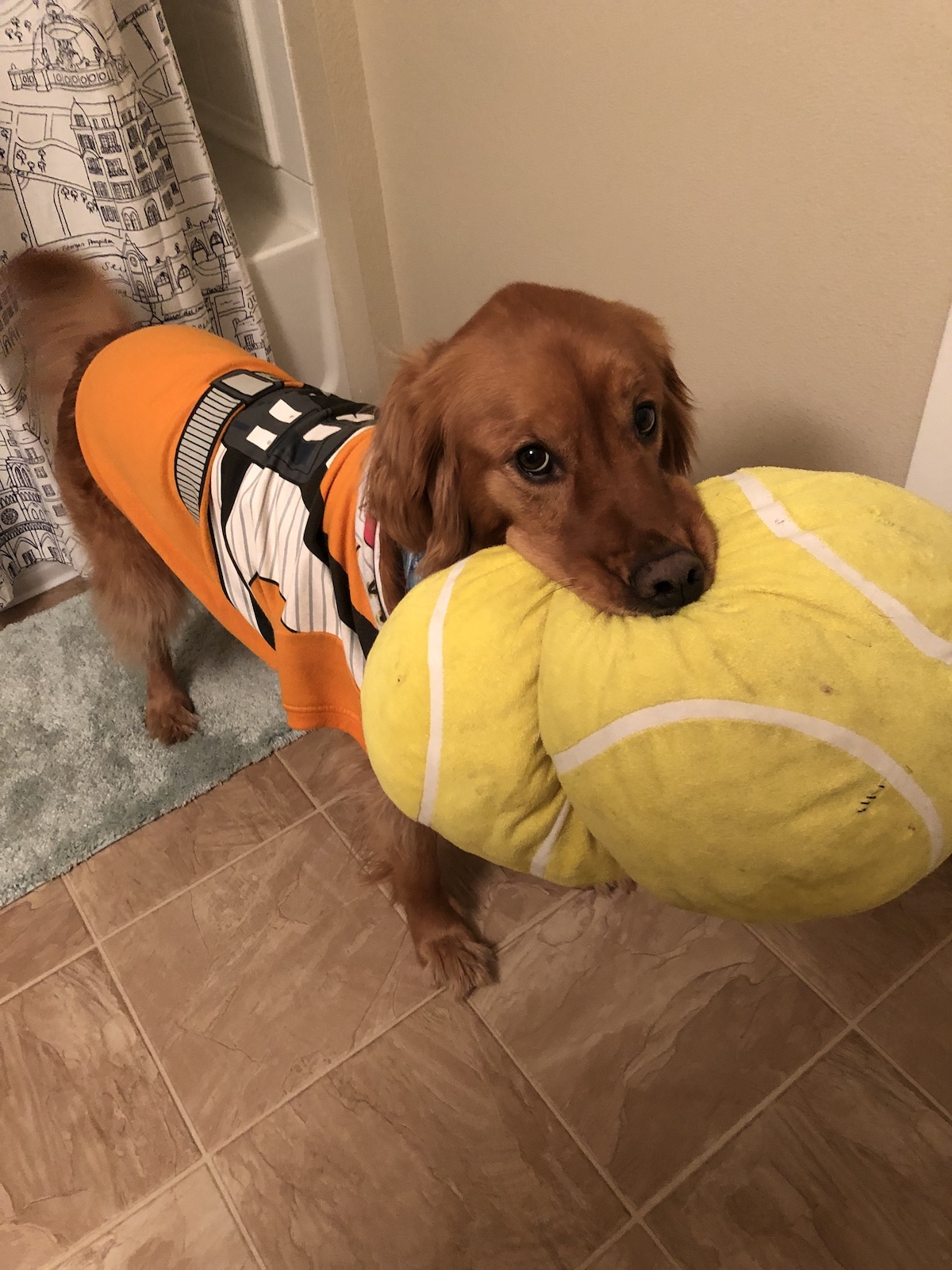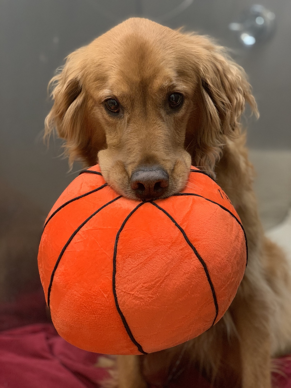 2022年02月22日這隻黃金獵犬波賽頓、或稱小波(Poseidon,簡稱Poi)去哪總是會叼著一隻絨布娃娃,像是人類小時候喜歡抱著一條小毯毯一樣,小波和主人一起出門散步逛街的時候,嘴裡也總是要咬著一個娃娃,牠才會覺得安心。