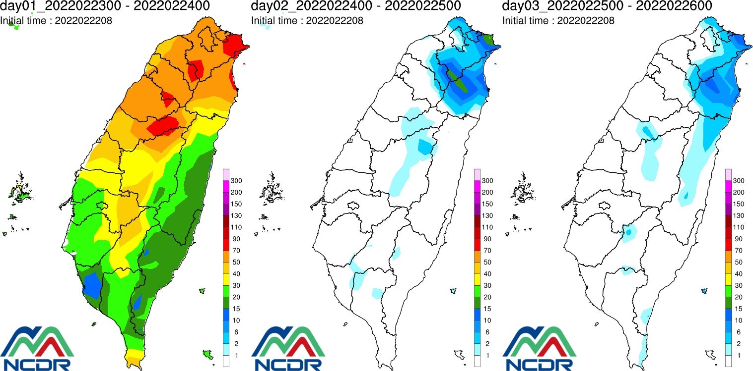 氣象局預報,今天水氣仍多,中部以北及東北部地區降雨較持續,花東降雨較短暫,偶爾會出現空檔。南部地區大多為多雲,僅局部地區有零星降雨,其中中部以北、東北部、東南部地區有局部大雨發生機率,這段時間全台降雨機率仍高。明晚後水氣逐漸減少,降雨情形也會減緩,中南部平地逐漸轉為多雲,迎風面的北部、東半部轉為局部短暫雨,降雨空檔增多。