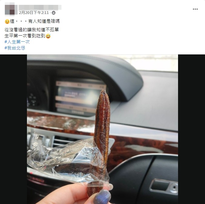 ▼從原po曬出的照片可以看到,她手中的棕色棒狀物長度不到10公分,外表被烘烤成焦糖色,並用塑膠紙包裝。原po問:「這…有人知道是啥嗎?從沒看過的讓我知道不孤單,生平第一次看到吃到。」