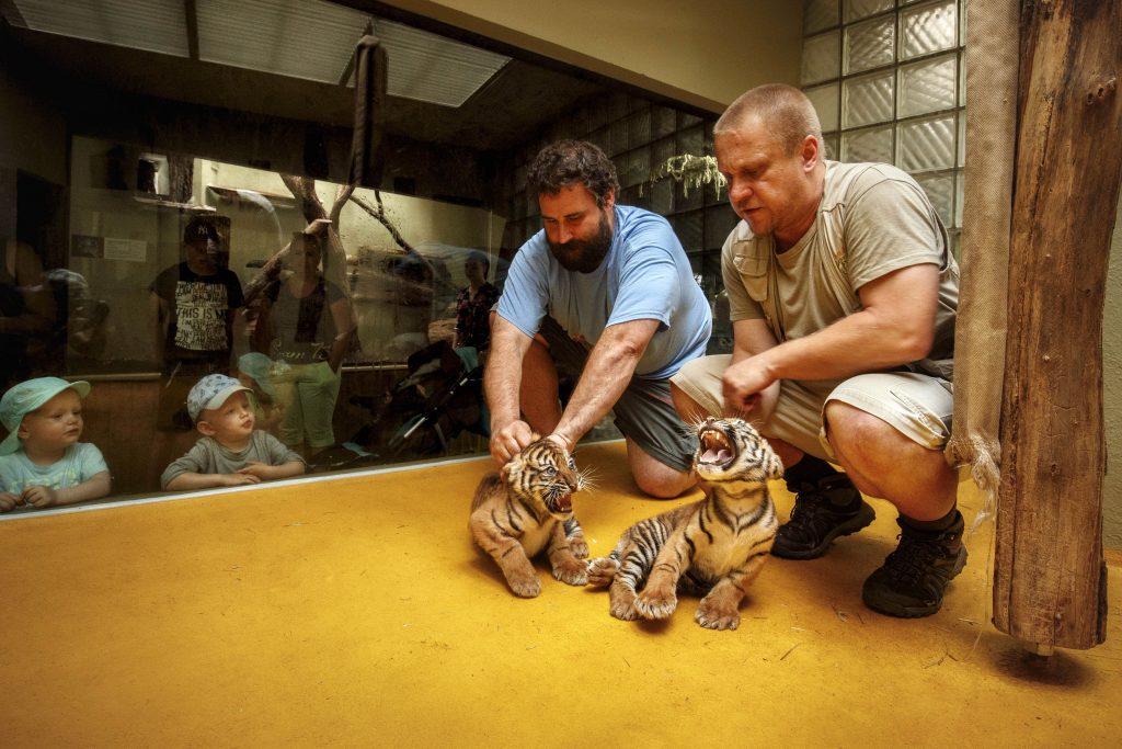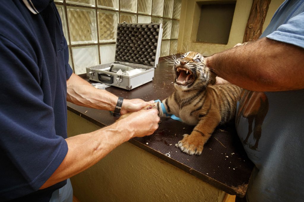 ▼捷克的「伊赫拉瓦動物園」裡,有2隻蘇門答臘幼虎,蘇門答臘虎是老虎中比較小隻的品種,但目前是屬於極度瀕臨滅絕的物種,而這2隻只有2個月大的小老虎正在接收獸醫的例行檢查。