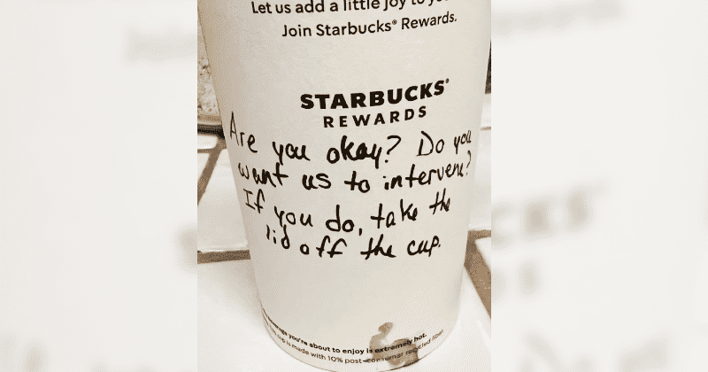 女孩的母親Brandy Roberson在臉書發文說,那天女兒獨自去星巴克看書學習,突然有一名穿著浮誇的陌生男人過來,大聲跟她搭訕。正當女兒不知所措時,一名咖啡師走了過來,送上一杯熱巧克力,說:「有人點餐後忘了拿,這請你喝。」女兒拿起杯子後,看到咖啡師在杯子上寫著:「你還好嗎?需要我們介入幫忙嗎?如果你需要的話,拿下杯蓋就可以。」