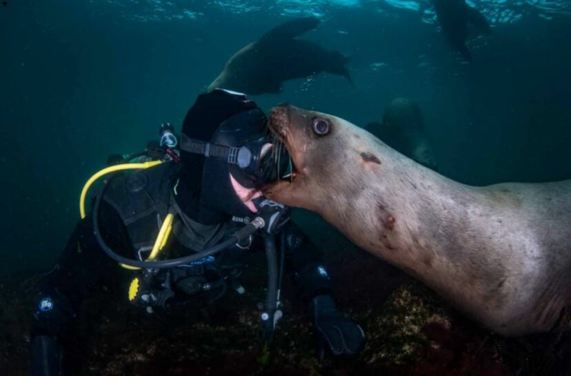 ▼海獅們正在這一海域等待鯡魚群的到來,被海獅團團圍住的Steve說:「最讓人驚嘆的是動物的數量遠遠超過了人類。這片海域是獨一無二的,世界上不可能再有一個地方,會有這麼多野生動物主動跟人類友好互動。」