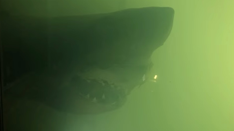 ▼透過微弱的光線,仍看到牠鋒利的牙齒和巨大的身型:(發現標本約18:00處)
