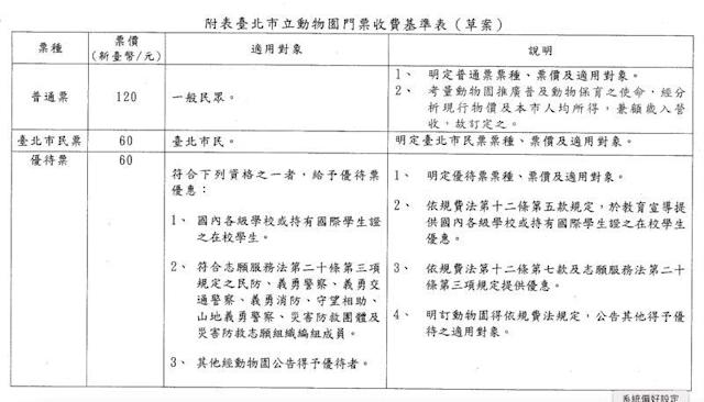 ▼根據新版「台北市立動物園門票收費標準」草案的規定,一般民眾全票調漲為120元、優待票為60元,台北市民票則訂為60元;團體票也有調漲,30人以上原本票價打7折之後為每人42元、調漲後每人84元。教育局副局長陳素慧說,新版的門票收費標準草案會公告14天,蒐集各界意見。如果民眾有意見可以向動物園反應,公告期間結束將送市府法務局審查,待市政會議通過就會發布實施,並且送台北市議會備查。