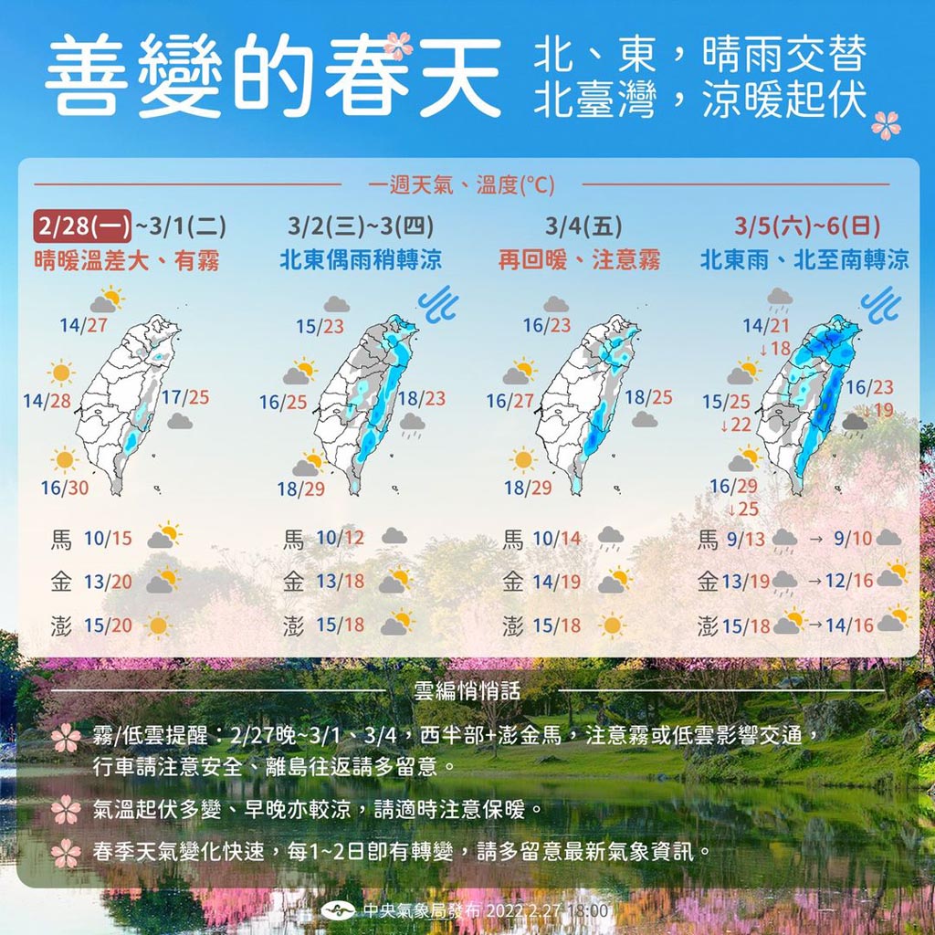 2022年02月28日今天(28日)東北季風減弱,風向轉為偏東風到東南風,白天高溫持續回升,西半部大多陽光普照,舒適溫暖,各地高溫可以來到24到30度。明天(3月1日)各地大多為多雲到晴,西半部日夜溫差大,僅東半部地區及北部山區有零星短暫雨。氣象專家吳德榮表示,本週會有2波冷空氣接力襲台,週三(2日)有一小股東北風增強;週六(5日)會有另一波東北季風南下。