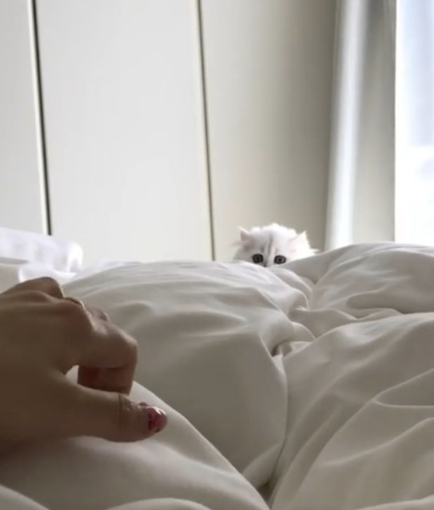 ▼馬麻躺在床上休息,Lily就躲在床邊,只露出靈動的大眼睛觀察。牠專注地盯著馬麻在棉被上移動的手指,3秒鐘後就撲過來。