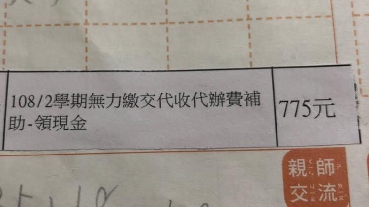 ▼原PO在社團貼文表示,孩子就讀的學校有提供單親、弱勢家庭代收代辦費補助,在老師好意的幫助申請核可後,不料卻在孩子的聯絡簿上貼了一條註記,「無力繳交代收代辦費補助」,認為「無力繳交」4字有貼標籤的嫌疑。