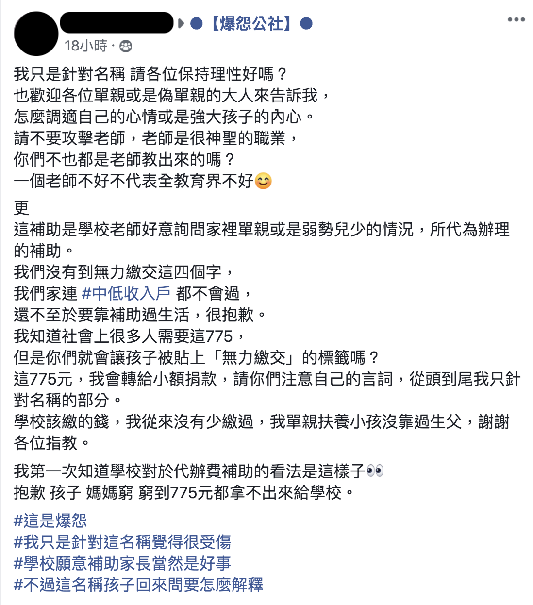 ▼她駁斥自己家還沒有到無力繳交的情況,不至於要靠補助過生活,會將這775元捐出,不希望孩子因為這775元被貼上「無力繳交」的標籤,並強調自己是針對這個名稱而感到不滿。