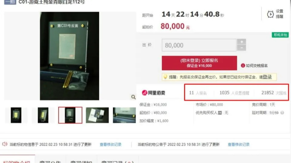 ▼最近阿里拍賣又有一張「黃金青眼白龍」卡牌遭法拍,起拍價為8萬元(約台幣35萬元)。想要參加拍賣,必須先支付1.6萬元(約台幣7.1萬元)保證金。這場競標從3月12日開始,但現在已經在網路上引發熱議,有1千多人將此拍賣設為提醒,並有2萬多人在線圍觀。