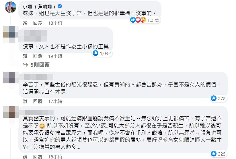 2022年03月02日2017年時,藝人小嫻(黃瑜嫻)自爆結婚後遲遲未懷孕的原因,竟是天生沒有子宮。她一直抱持正面態度,樂觀看待這件事。最近她看到一名女網友因沒有子宮而苦惱,於是親自留言安慰說:「姐也是天生沒子宮,但也是過的很幸福。」