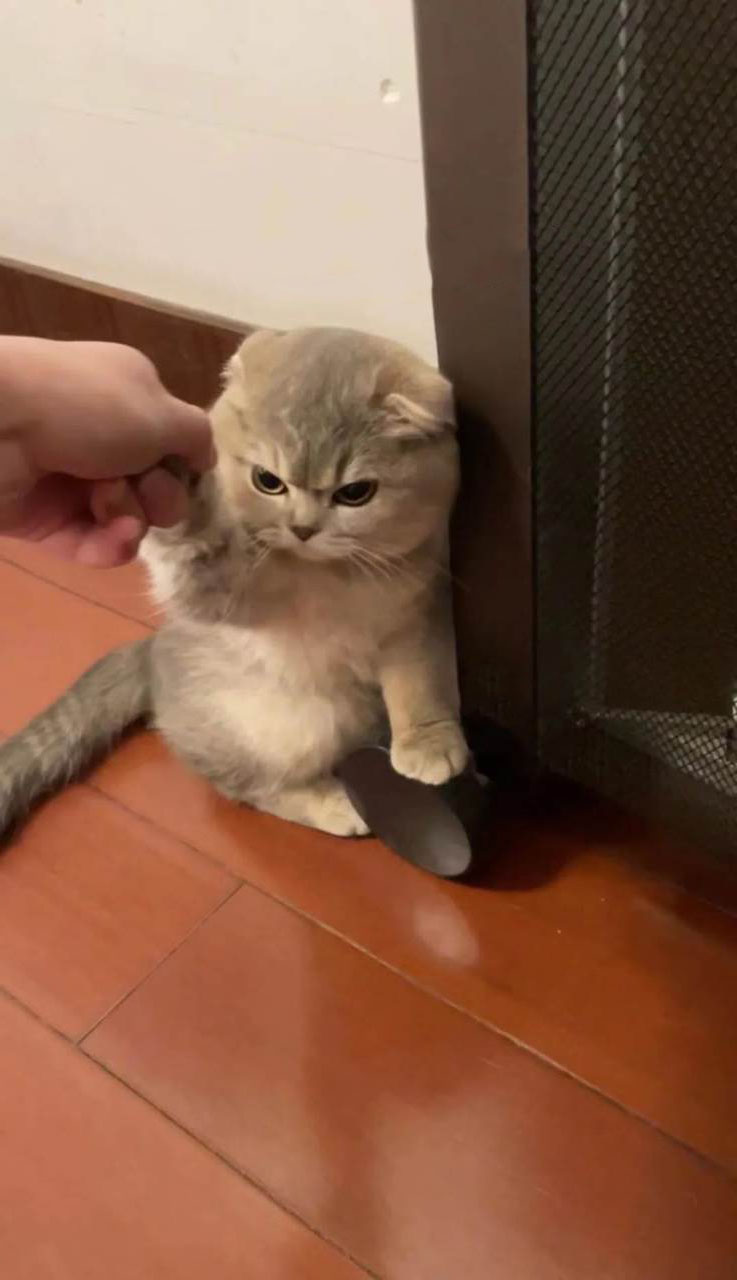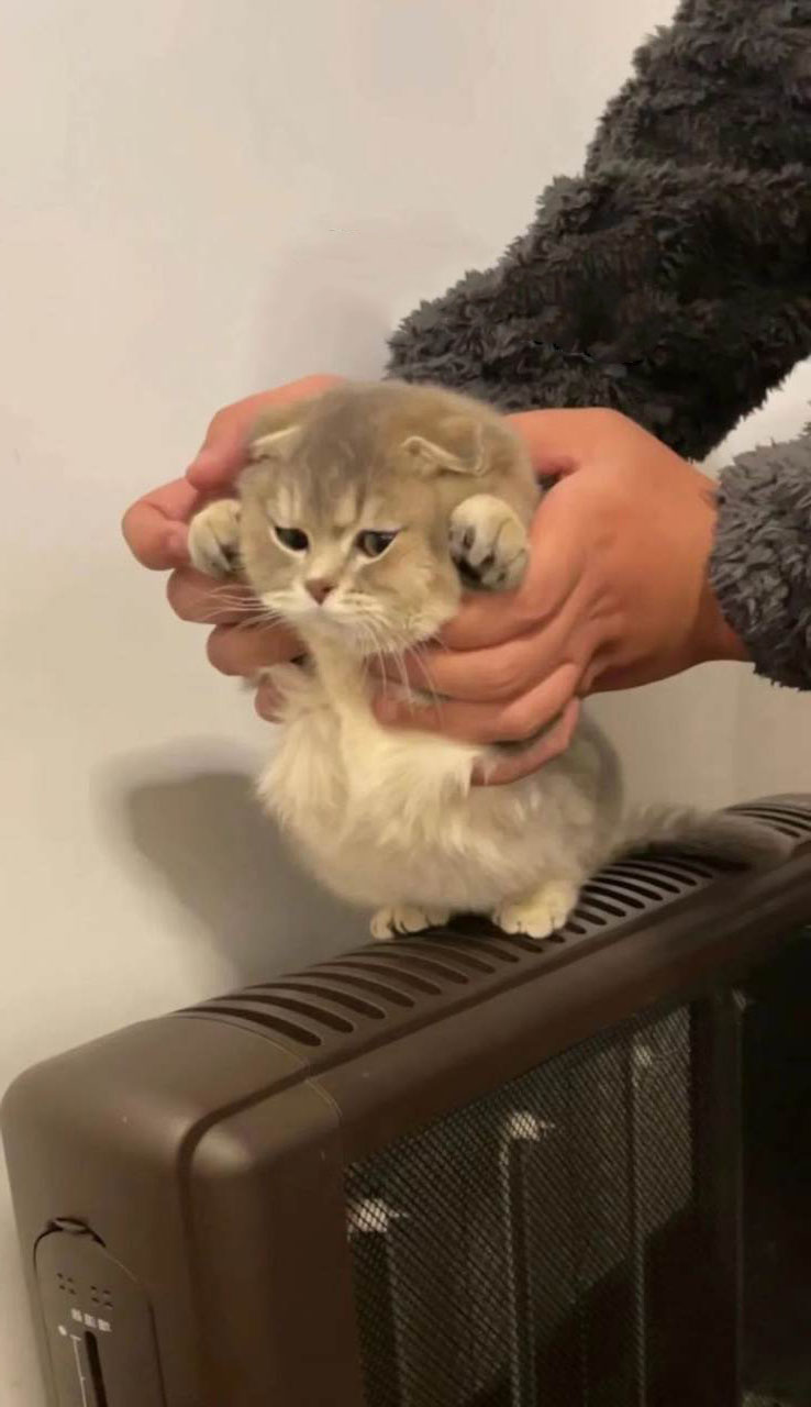 ▼飼主抱起貓咪,貓咪卻不願意離開。牠的腳腳堅持踩在電暖器上,圓嘟嘟的小臉上掛著委屈的表情,好像在說:「我不要離開,這是家裡最舒服的地方,我才不要走!」