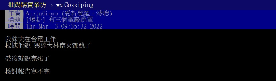 ▼全台大停電後,一名網友在PTT發文說,自己的妹夫在台電工作,透露目前有3個電廠跳電,包含興達、大林、南火。事件爆發後,原po的妹夫崩潰表示「完蛋了」,因為接下來檢討報告會寫不完。