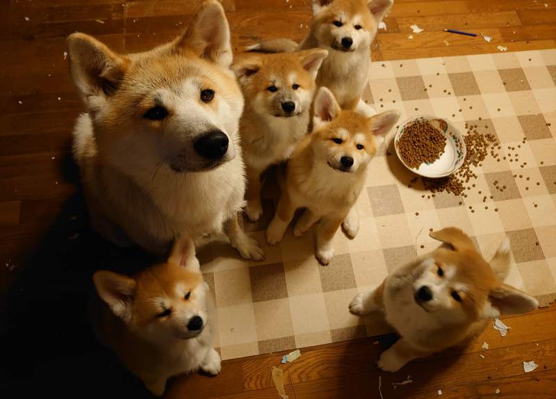 ▼牠們不肯好好吃東西,把飼料掀翻,害媽媽跟著一起挨罵。這張照片在推特引發話題,按讚數超過20萬,大家都覺得秋田犬一家很可愛。