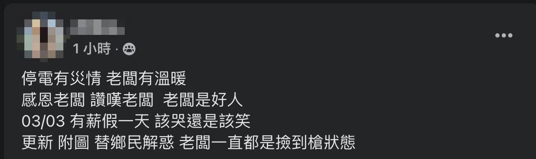 2022年03月05日興達電廠開關場事故造成全台無預警大停電,不少上班族工作到一半突然漆黑一片。台中一位老闆發現停電後,用LINE通知員工休息一天,還說「不要讓我看到有人進公司」,而且不扣除薪資。網友們看到後都很羨慕,紛紛表示:「別人家的老闆從不會讓人失望。」