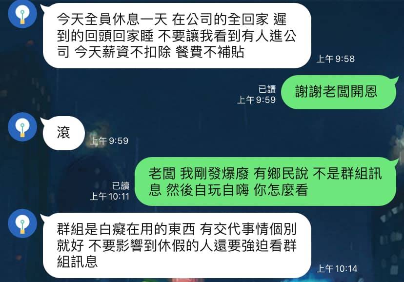 ▼員工收到訊息後說「謝謝老闆開恩」,老闆則霸氣回了一個字「滾」。隨後員工將訊息po到臉書,有網友質疑說「又不是群組的文,自玩自嗨」。他將這件事告訴老闆,老闆回應說:「群組是白癡在用的東西,有交代事情個別就好,不要影響到休假的人還要強迫看群組訊息。」