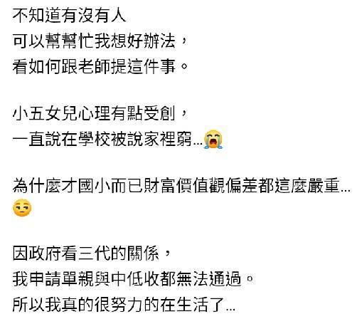▼單親母親吐苦水,小五的女兒在校被嘲笑家裡窮導致心理受創,疑惑:「為什麼國小而已價值觀這麼偏差」,而且由於申請單親補助及中地收入戶需要看三代的關係,因此無法通過,不禁抱怨:「我真的很努力的在生活了。」