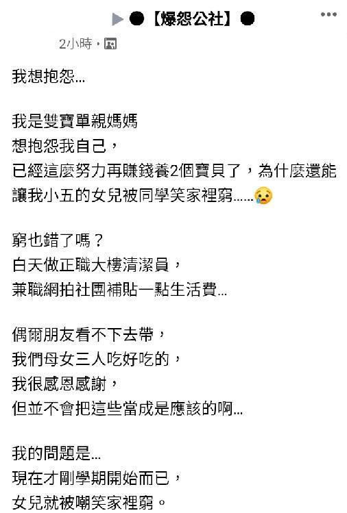 2022年03月07日單親父母往往要背負比一般雙親家庭的任一方更重的責任,還要承擔家中的經濟重擔,又要照顧養育孩子,往往會被壓得喘不過氣來。有一位單親母親就在臉書社團發文抒發心聲,表示為了要養育兩位小孩,已經很努力賺錢,自己一人身兼二職,早上當大樓清潔員,晚上還兼差網拍社團補貼生活費,但才剛開學而已,女兒居然在學校被同學嘲笑家裡窮。