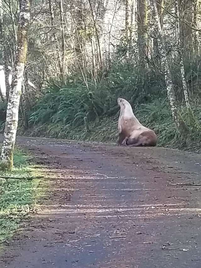 ▼這片森林位於俄勒岡州北部,最近的水源為考利茲河(cowlitz river),距海獅所處的位置非常遠。不過考利茲河確實生活著很多海獅,員警認為這隻海獅可能是沿著暗渠捕捉獵物,不知不覺間迷路,這才爬到了樹林裡的道路上。