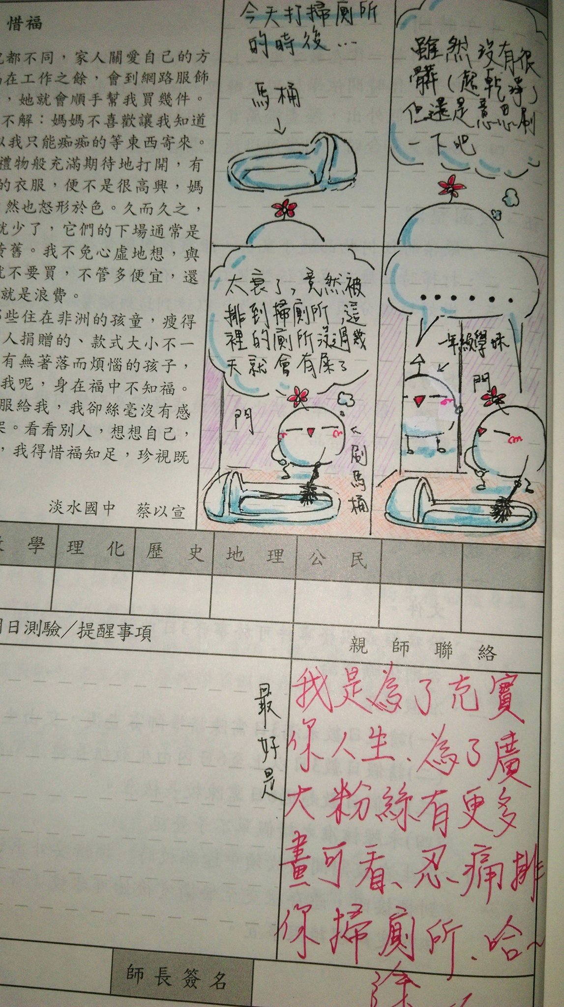 2022年03月08日史上最讓人想一直讀下去的聯絡簿!就讀中華大學的女網友覺得國三弟弟寫的生活札記很好笑,於是決定把聯絡簿的內容上傳到網路給大家看,沒想到還真的引起大家的注意!什麼「因為天氣很冷,那邊就會變小,我是說膽子」、「今天我媽把仙草跟奶茶混在一起,喝起來就跟把奶茶和仙草混在一起的味道一樣」,每一句都超有梗,害大家都笑到並軌!