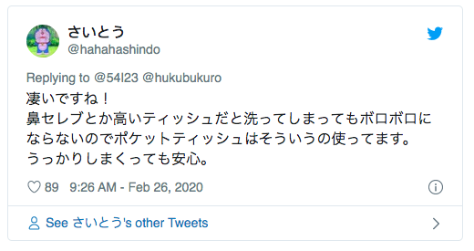 ▼還有人從源頭解決問題:「鼻貴族(保濕衛生紙)這種較貴的面紙就算洗也不會產生紙屑,我隨身帶的面紙都用那種。就算不小心跟衣服一起洗到也很安心。」