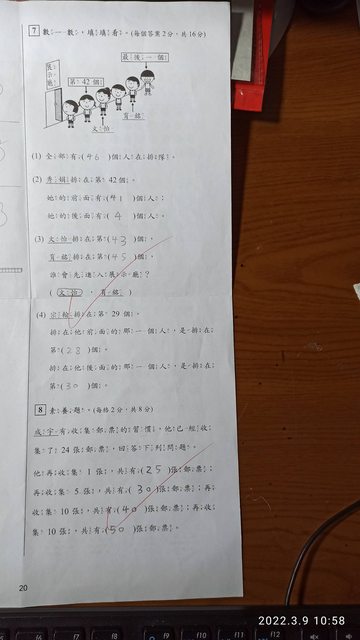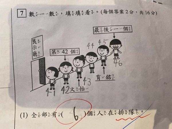 陳昶宇表示,他看到友人女兒的國小一年級考題,題目上詢問「全部有()人在排隊」,要學生在()內寫下答案。從圖片中可以看到,一個展示廳外共站了6個人,排在第2位的人頭頂上註明「第42個」;排在最後的人頭頂上則寫著「最後一個」。