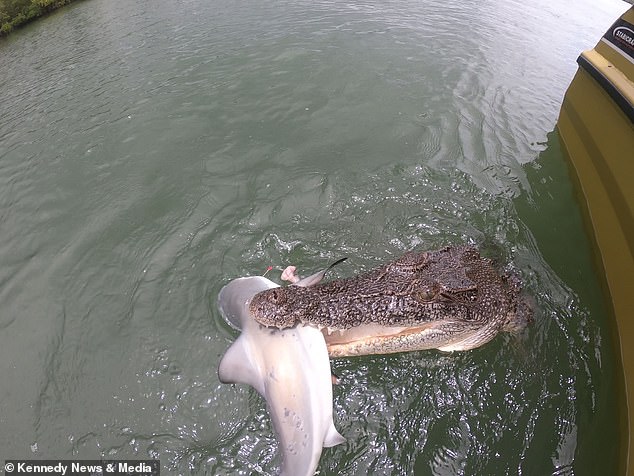 ▼Barnes拉住釣竿,想把鯊魚從鱷魚的嘴巴裡搶回來,但鱷魚的力量太大,他最終決定將鯊魚讓給鱷魚,讓牠飽餐一頓。Trutwein說:「我拍攝野生動物30年了,經常看到鱷魚,但從來沒有遇到過這樣的事。這太令人震驚了,近距離看到這一幕簡直難以置信!」