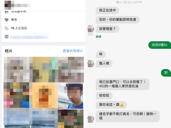 ▼原po表示,她日前使用外送平台訂餐,外送員跟她聯絡問:「放管理室?」她立刻回:「送到8樓8C。」沒想到外送員竟然說:「唉,廢人嗎?」原po不想多做回應,只好回答:「對。」後來外送員將餐點送到門口,要她自行取餐,又繼續辱罵「一堆廢人果然是吃貨」、「連名字都不敢打真名,可悲啊!廢物一個」。