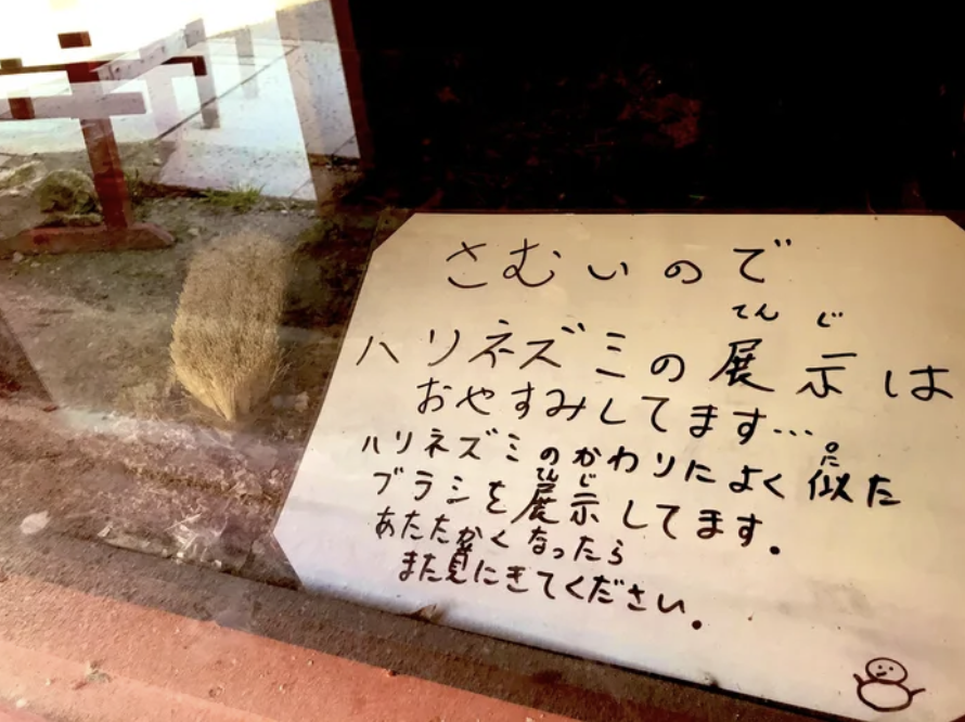 ▼只見刺蝟的展示空間裡,竟然有一個鬃刷代替刺蝟,旁邊的告示牌上寫著:「因為最近天氣寒冷,刺蝟暫時沒辦法和大家見面。但為了滿足大家想見刺蝟的心情,我們特別請了和刺蝟很像的『鬃刷』來跟大家打招呼,等到天氣變溫暖後,可愛的小刺蝟就可以和大家重新見面喔。」