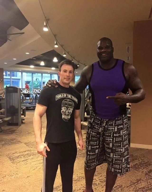 ▼「俠客」歐尼爾(Shaquille O’Neal)身高足足有216公分,身材也是超級壯碩的類型。克里斯伊凡跟他站在一起,瞬間「窄」了不少。想不到美國隊長也有這麼嬌小的時候。