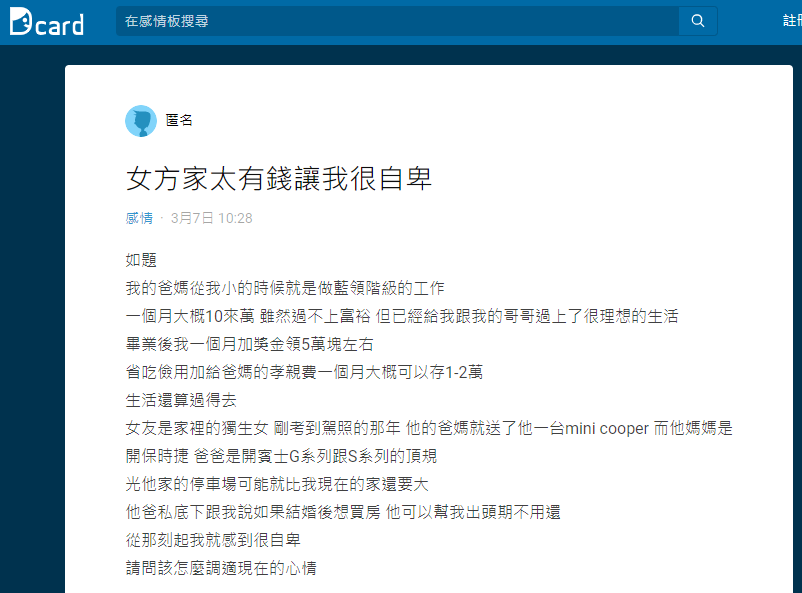 ▼原po的女友家境很好,她是富裕人家的獨生女,媽媽平時開保時捷代步,爸爸則有賓士G系列和S系列的頂規跑車,女友剛剛考到駕照就收到百萬以上的Mini Cooper。「光她家的停車場可能就比我現在的家還要大」。女友的爸爸私下向他提議,如果他們婚後想買房,可以幫忙出頭期款,而且不用還,這讓原po覺得很自卑。