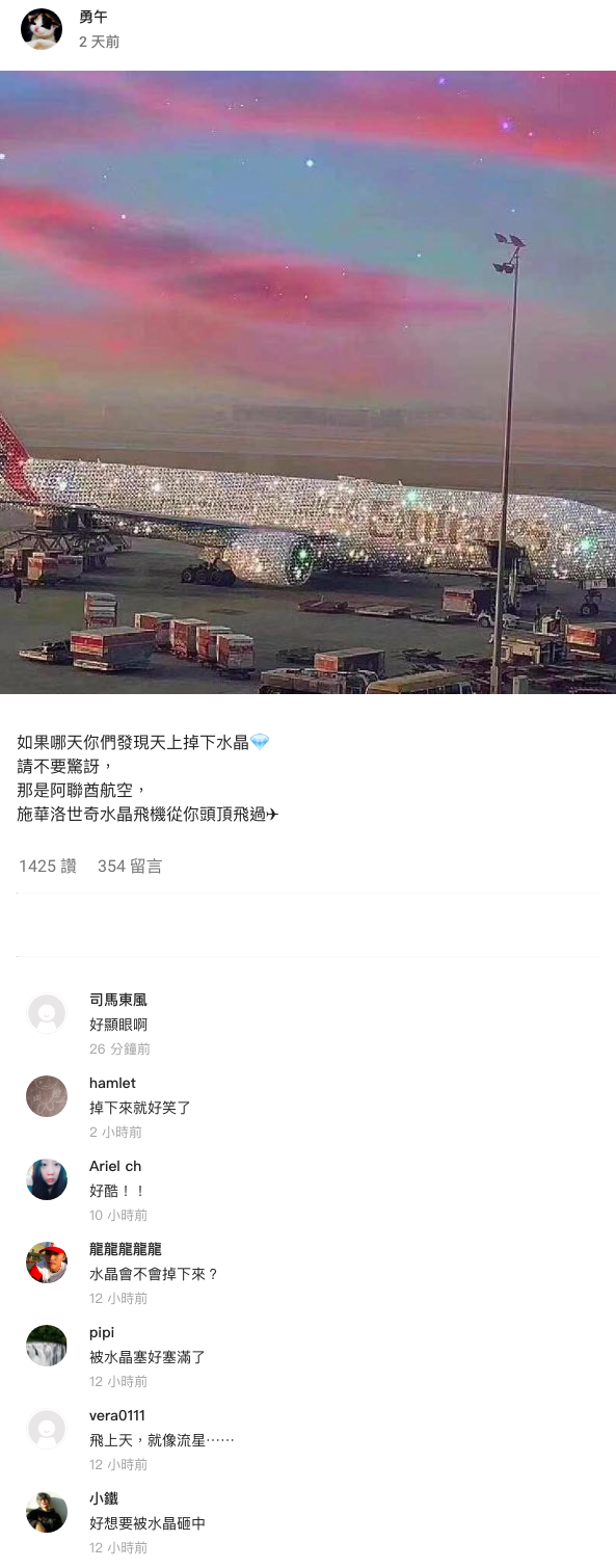 ▼一位網友po圖並發文:「如果哪天你們發現天上落鑽石(水晶),那是阿聯酋航空施華洛世奇水晶飛機,就是這麼好看。」