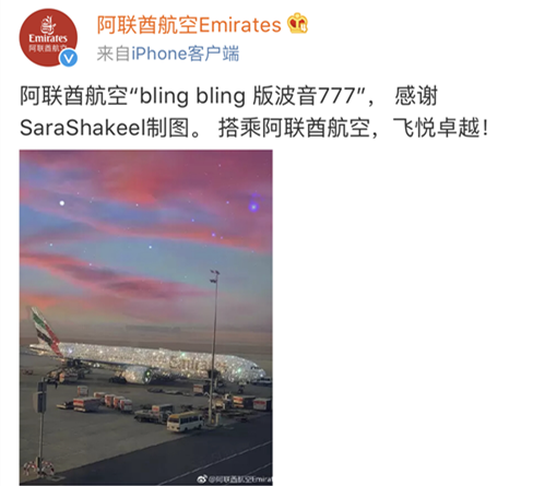 ▼阿聯酋官方帳戶也曬出了這張「bling bling版波音777客機」的圖片並表示這是一位叫「Sara Shakeel」的粉絲製作的。