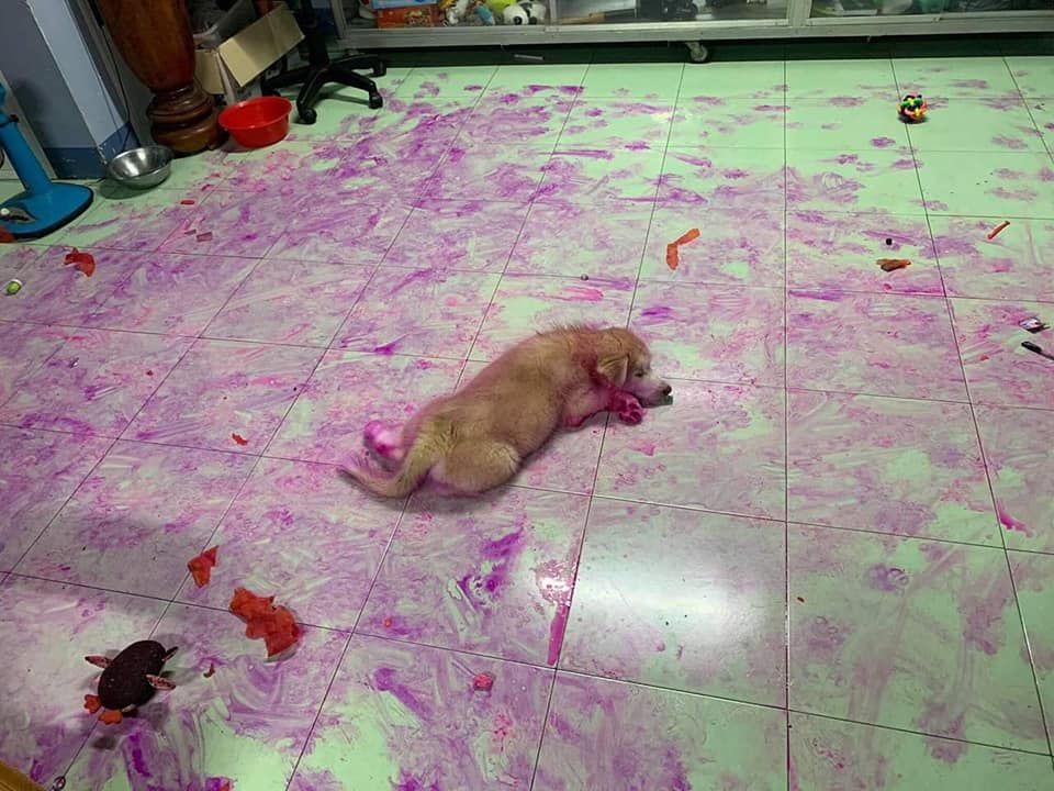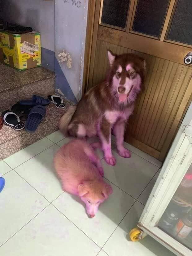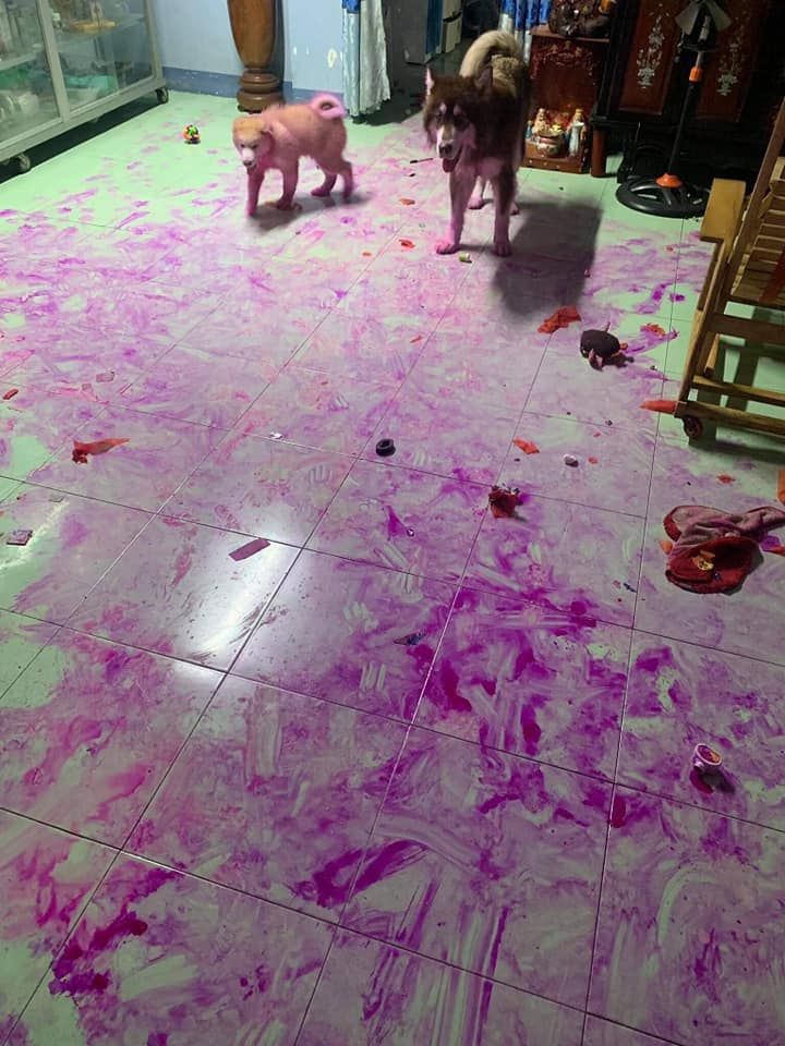 ▼兩隻狗狗身體都上了紫色,看來主人不僅要掃客廳,還要給狗狗們洗澡。