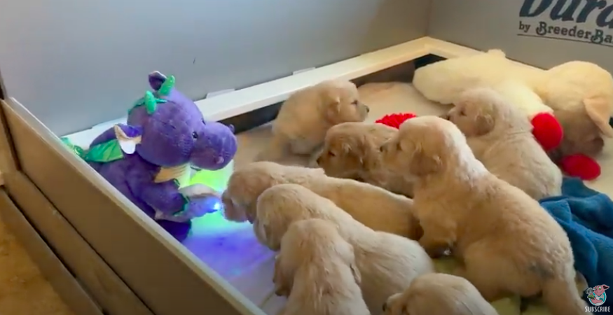 ▼一隻紫色的龍龍玩偶坐在角落,手裡捧著一本發光的書,正滔滔不絕地講故事。它講故事時還會左右搖晃身體,看起來很專注。狗寶寶們圍坐在身邊,都探著胖乎乎的身體往前擠,牠們對發光的書非常好奇。