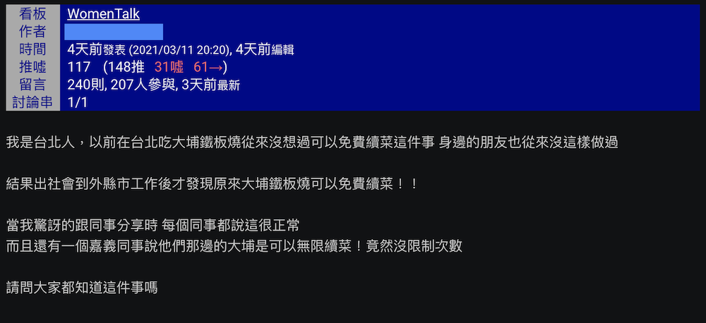 2022年03月16日大埔鐵板燒價格親民,份量又多,每到用餐時間都人潮滿滿~日前一名在台北長大的男網友在PTT上發文表示,他長大後到外地工作才知道大埔鐵板燒可以免費續菜一次。有住在嘉義的同事告訴他,有些分店甚至可以無限續菜。他大吃一驚,詢問網友:「請問大家都知道這件事嗎?」