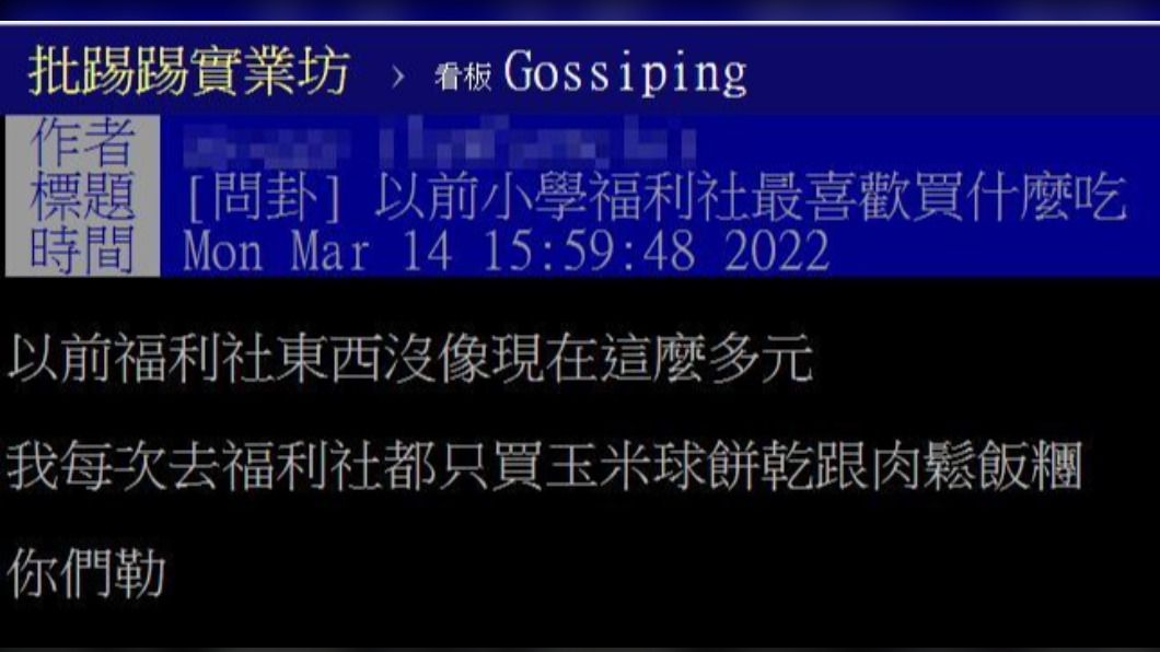 ▼原po表示,以前福利社的商品種類不如現在多元,但在他的心中仍有一定地位。他每次去福利社都只買玉米球餅乾跟肉鬆飯糰。他好奇詢問網友們:「以前小學福利社最喜歡買什麼吃?」