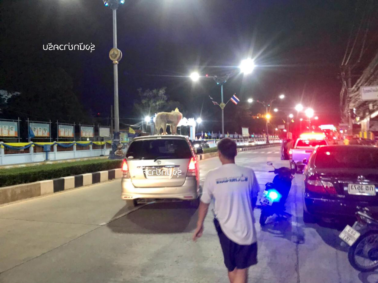 ▼車主實在沒有辦法,只好報警請求協助。警察趕到後試著大叫讓Sip Saen下來,但牠一臉嚴肅地坐在車頂,眼神望向遠方,不為所動。後來大家又用食物哄牠,Sip Saen吃了幾口後還是坐在上面不下來。