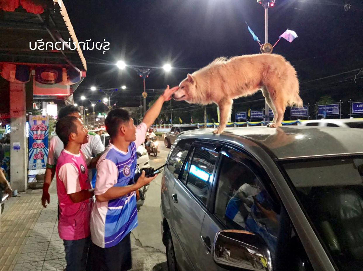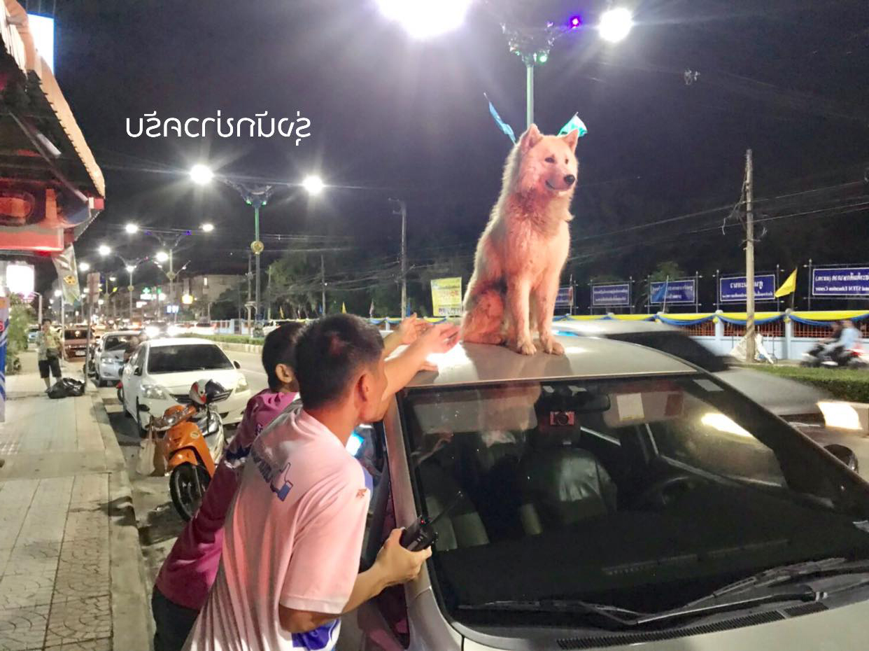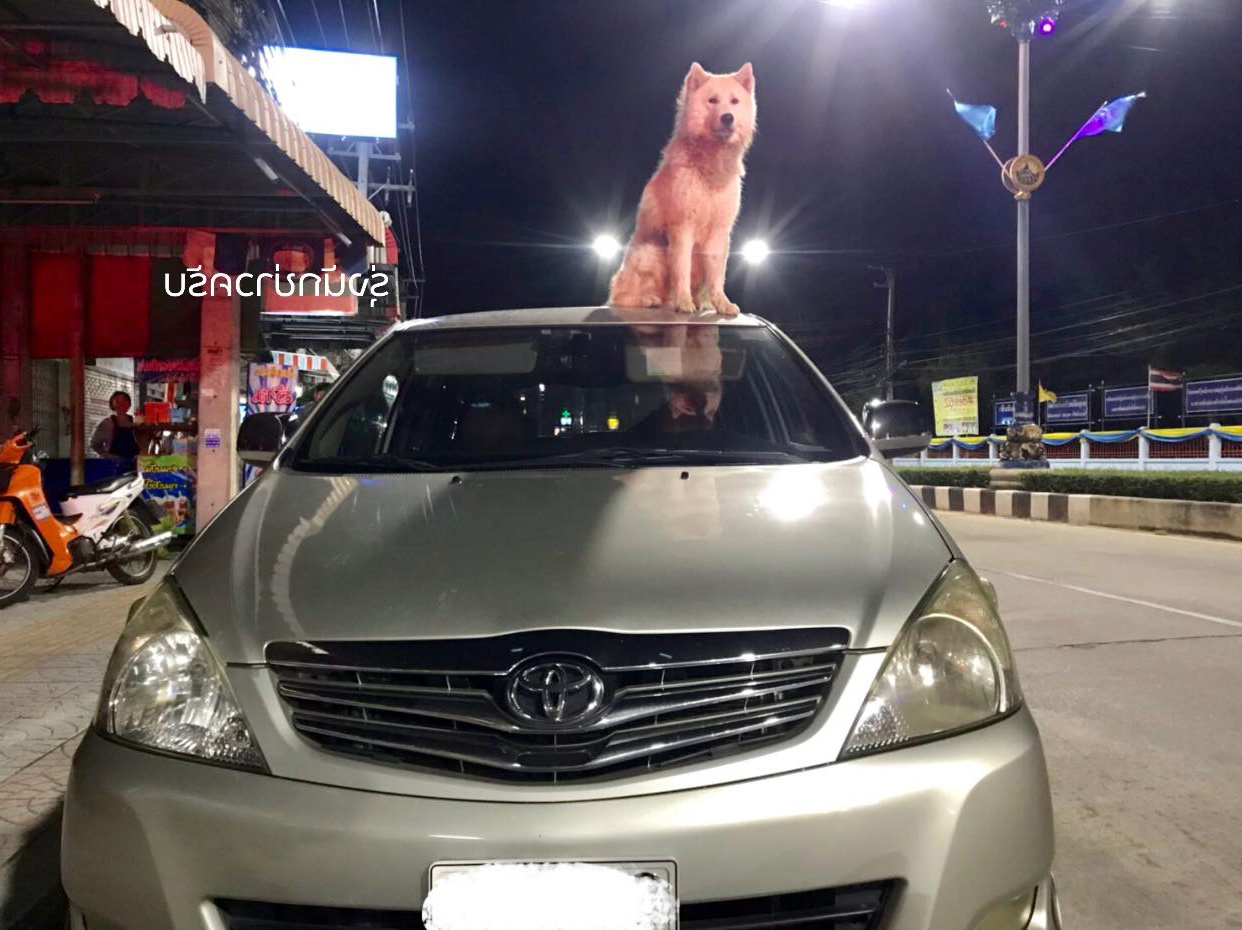 ▼當時女車主準備從學校接孩子回家,結果發現一隻白色的狗狗從引擎蓋跳到了車頂上。這隻狗狗叫Sip Saen,經常會霸佔車頂,在當地小有名氣。只見牠穩穩坐在車頂上,不管車主怎麼驅趕都不下來。