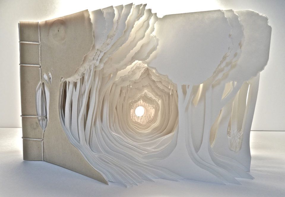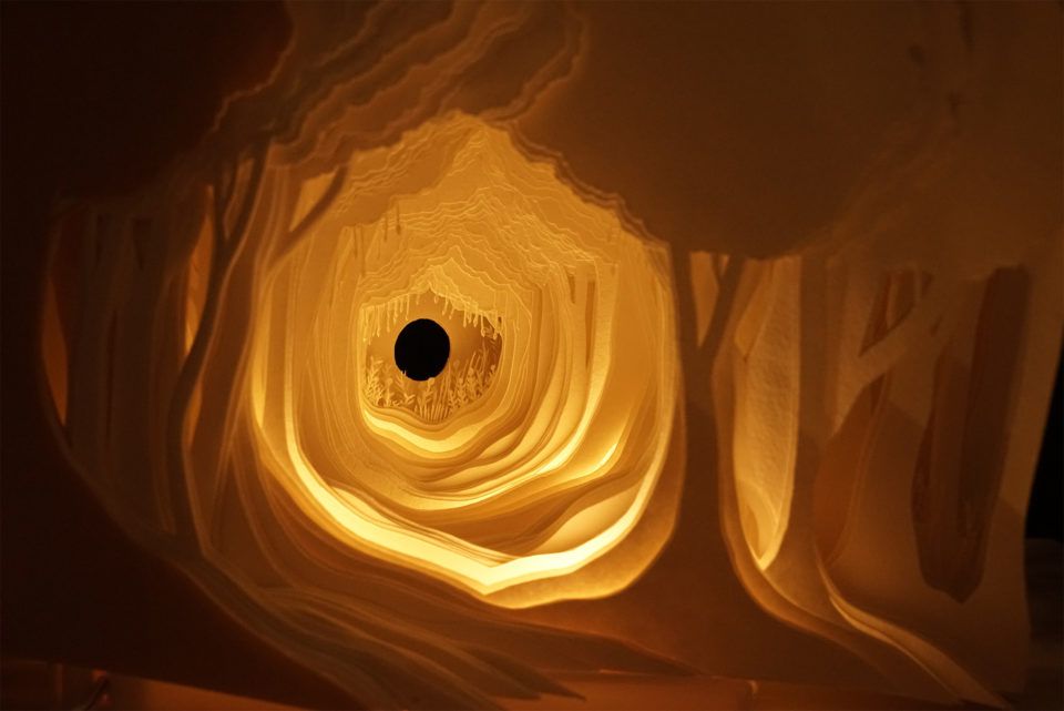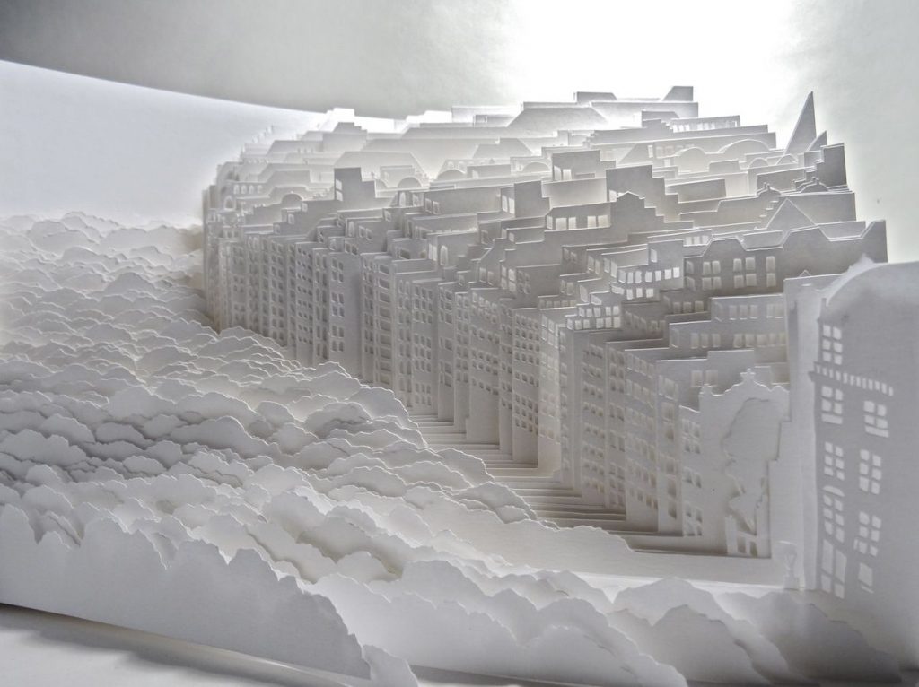 ▼她的作品用到幾十層甚至上百層的白紙,藝術家在層層紙張上雕刻出微型的圖形,有房屋、森林,也有夢幻雲海。