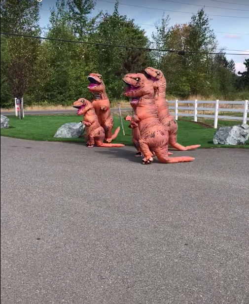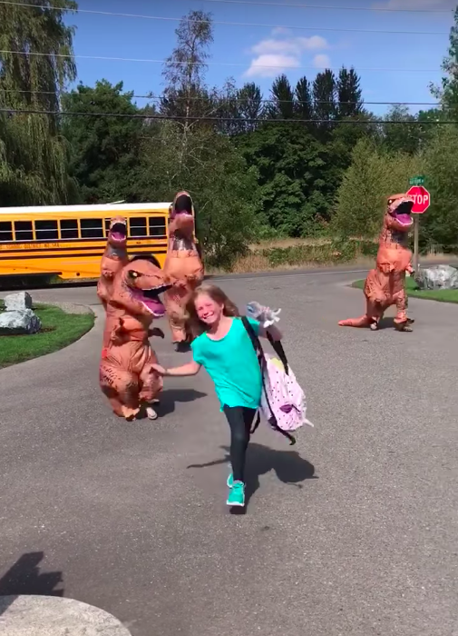 2022年03月18日家人之間很需要幽默感。華盛頓一名女孩放學後搭校車回家,剛剛下車就被5隻「龍」嚇了一跳。原來家人來接她放學,卻全都穿著充氣裝。5隻龍搖搖晃晃跑過來的畫面太有趣,網友們都被笑翻了。
