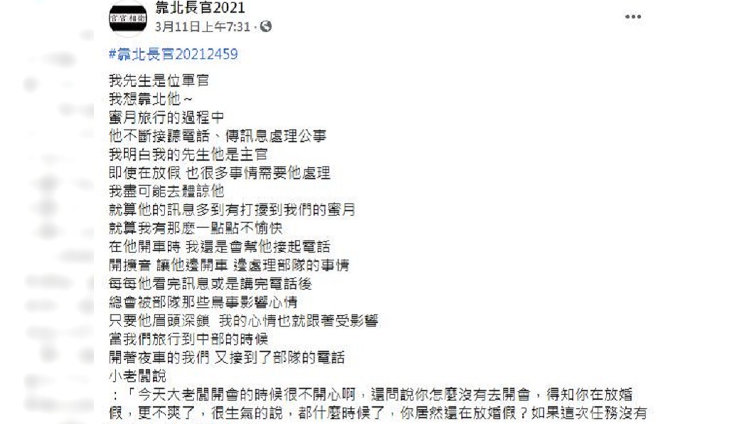 2022年03月18日軍人的工作非常特別,平時很少有時間跟家人團聚,所以格外珍惜休假的時間。日前一名人妻在臉書粉絲團「靠北長官」發文表示,先生是軍隊的軍官,不久前向上級呈報請婚假。兩人蜜月旅行期間,先生卻不斷接到長官的電話,公事處理不完,最後只好提前結束假期。