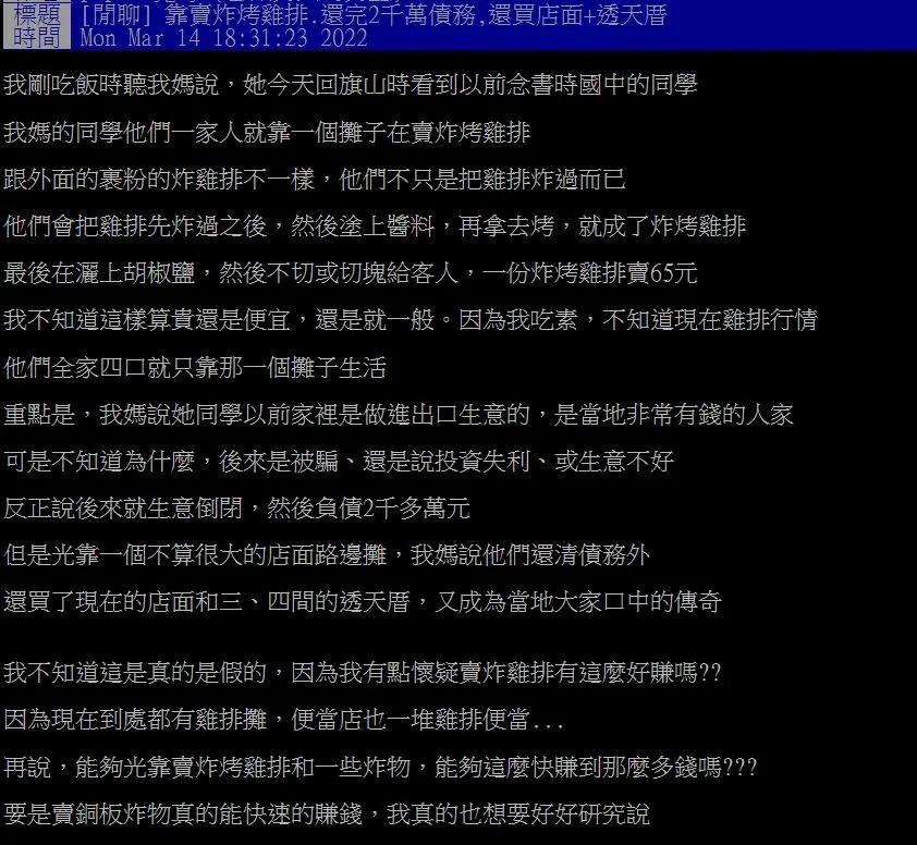原po表示,近期媽媽回家鄉時遇到以前的國中同學,對方家中過去從事進口生意,身家豐厚,後來因為投資失利欠了2千萬債務。為了賺錢,一家四口改在路邊擺攤賣雞排,一份賣65元。沒想到他們很快翻身,不僅還清了債務,還買了店面和3、4棟透天厝,這經歷成為了當地大家口中的傳奇。