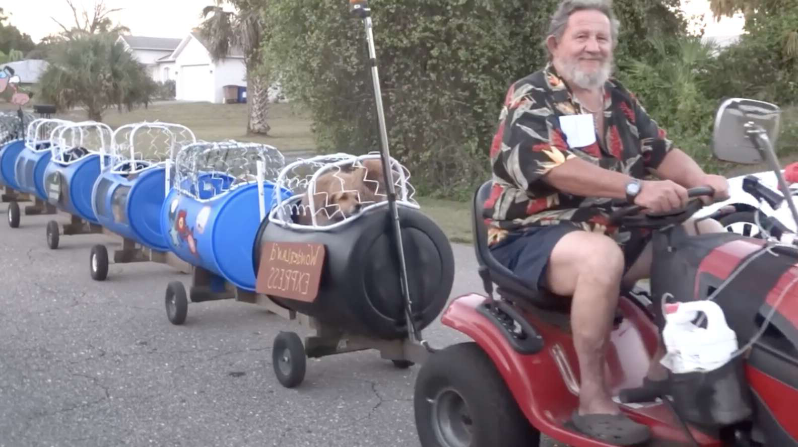2022年03月22日這輛狗狗小火車太酷啦~國外夫妻Alice和Paul在哥斯大黎加經營多年動物救援收容所,8年前他們將收容所裡的十幾隻狗狗全部搬到了佛羅里達州的利哈伊英畝(Lehigh Acres)。為了更好地帶狗狗外出兜風,Paul專門做出了一輛可愛的「狗狗小火車」。